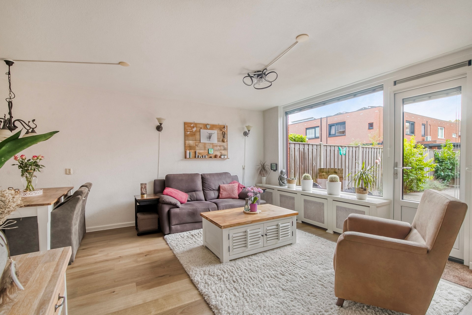 Lichte woonkamer met open toegang tot de keuken aan de voorzijde. De woonkamer kent door de ronde muur een speelse, maar toch logische indeling en is voorzien van een vaste kast en achterdeur met toegang tot de tuin.