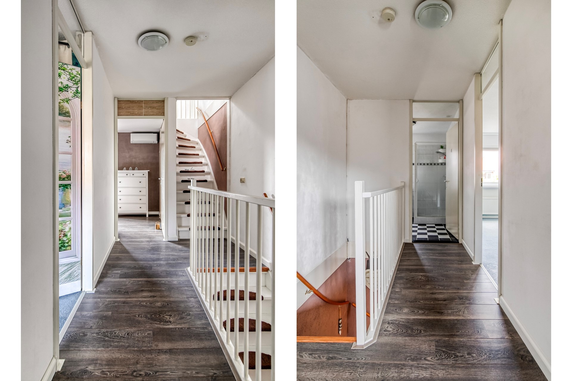 Ruime overloop met toegang tot slaapkamer 1, slaapkamer 2, de badkamer en de trap naar de tweede verdieping.