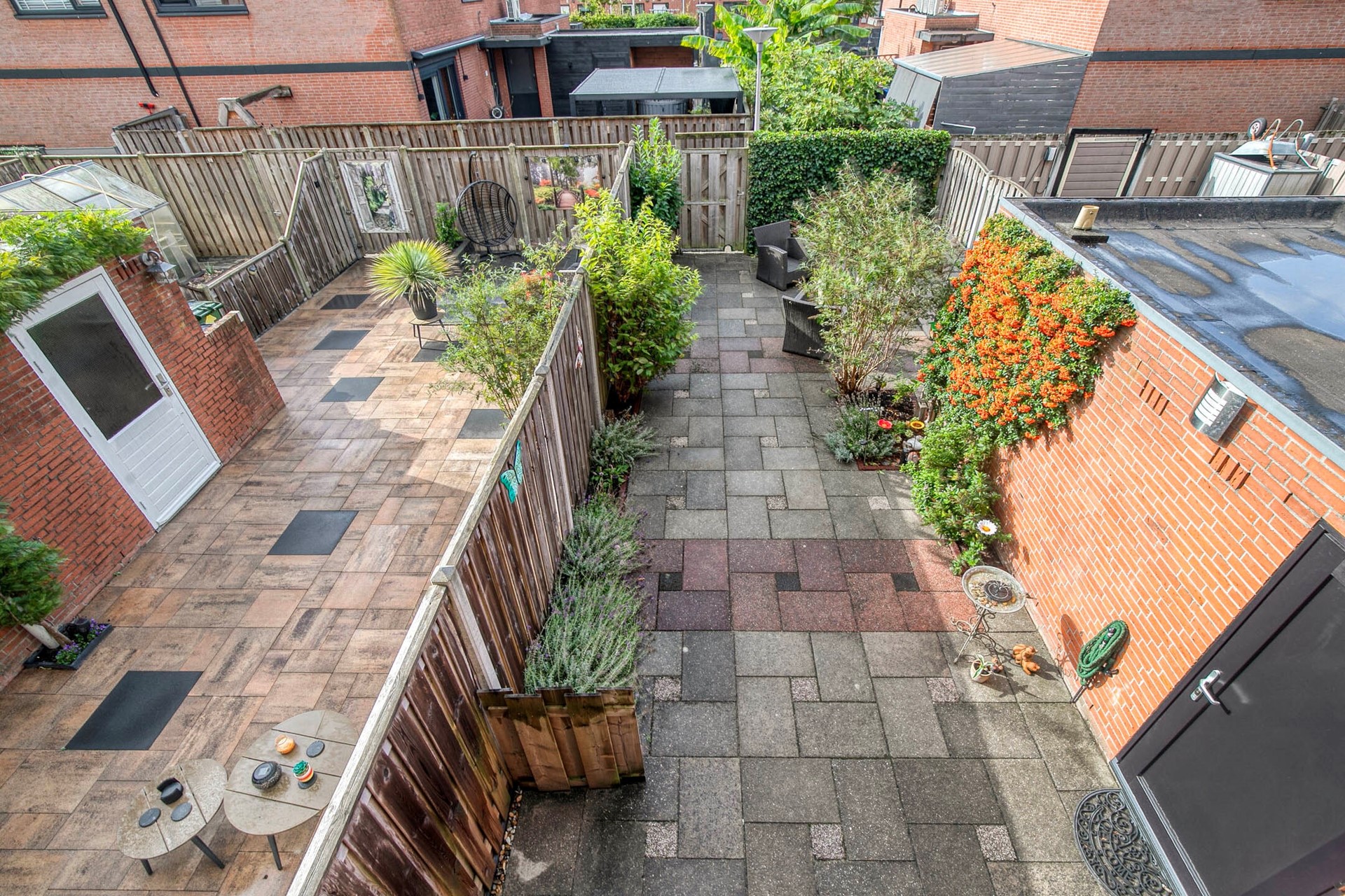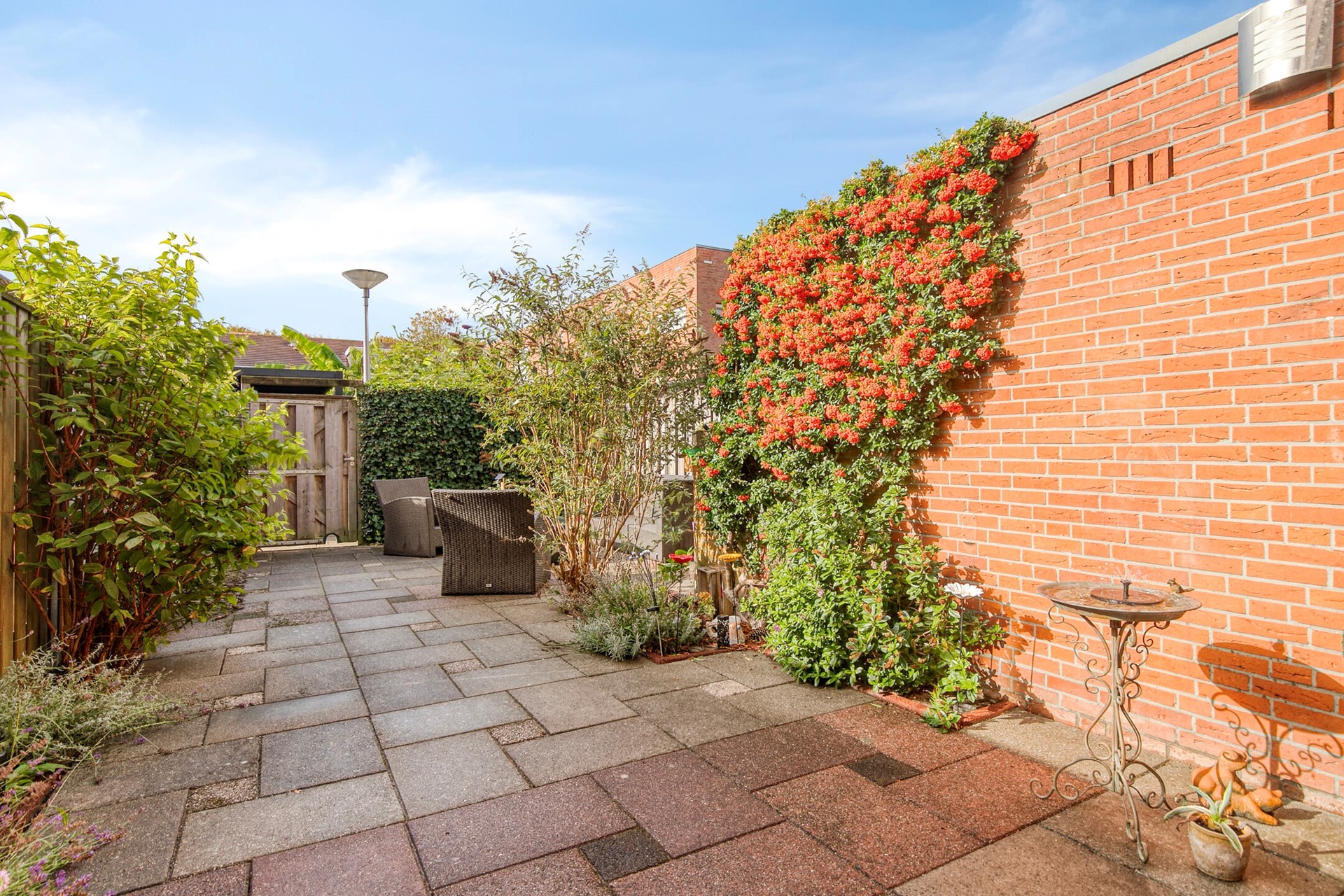 Fraai aangelegde tuin met stenen berging en achterom.