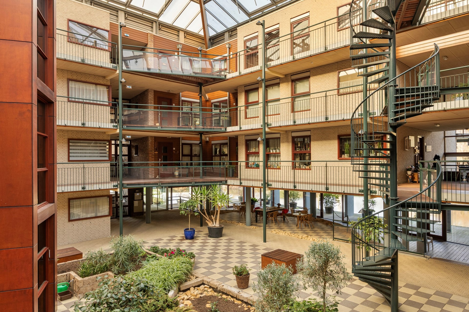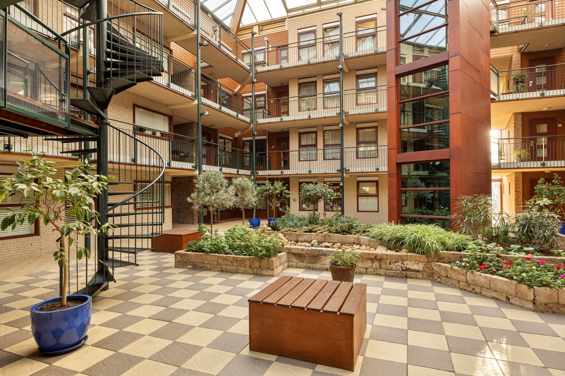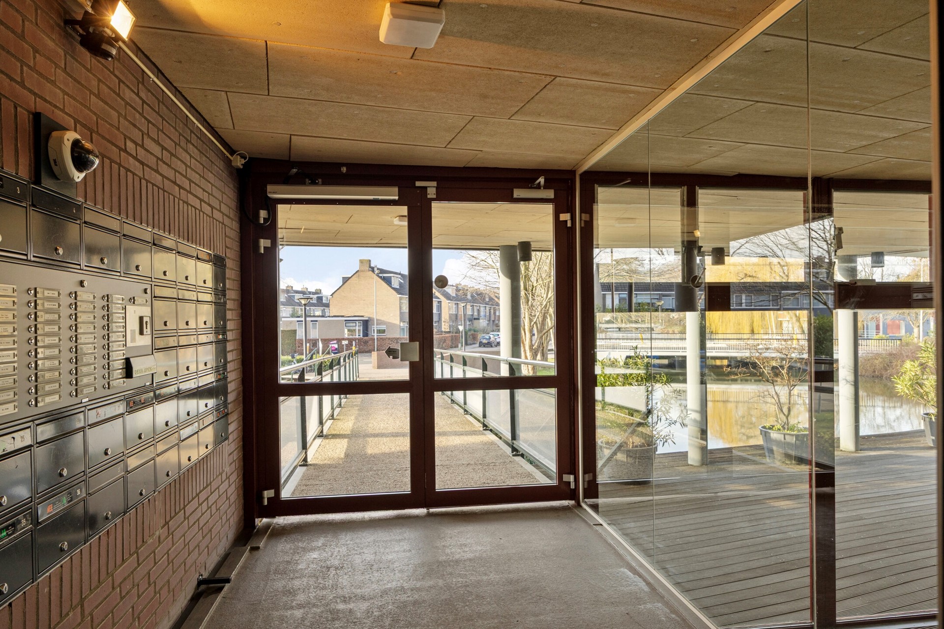 Afgesloten entree met bellentableau en postportaal. Binnentuin met toegang tot de lift en het trappenhuis.
