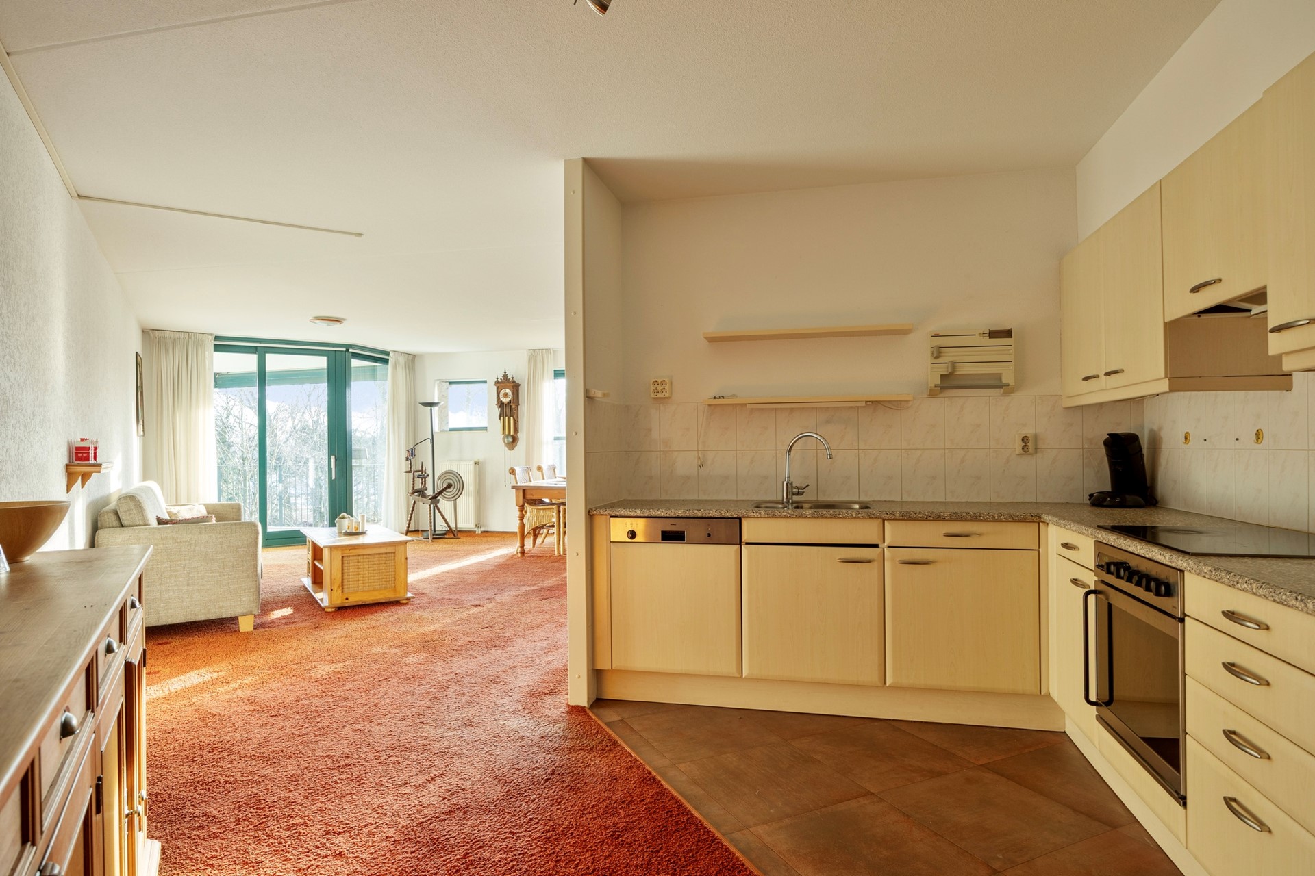 De open woonkeuken vormt het hart van het appartement. Momenteel is de keuken gedateerd en eenvoudig van aard, maar er is ruimte genoeg om er een luxe woonkeuken van te maken. Via de keuken kan de slaapkamer aan de binnenzijde worden bereikt.