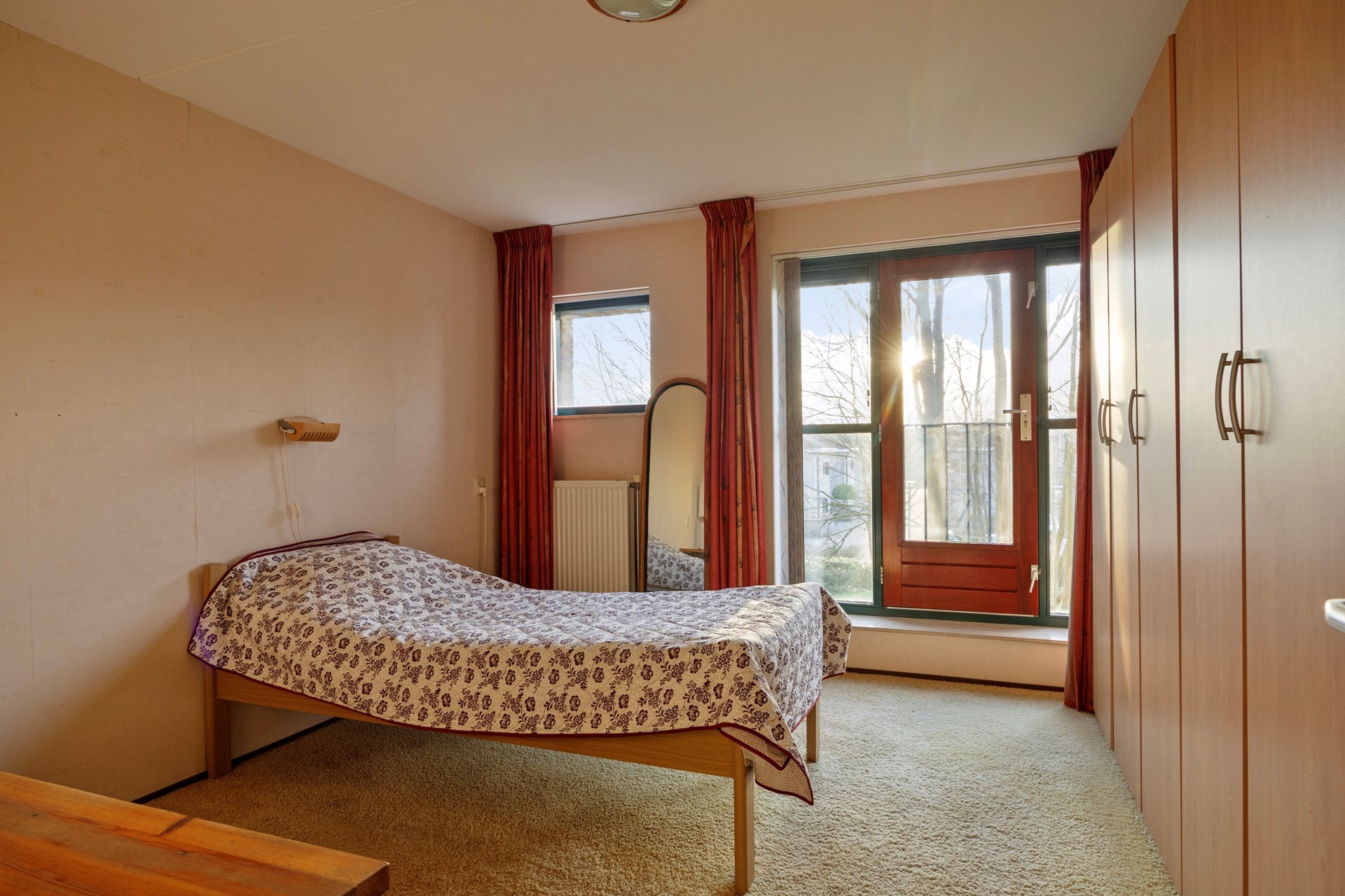 Riante slaapkamer die momenteel plaats biedt aan een grote garderobekast. De kamer is voorzien van een gezellig frans balkon.