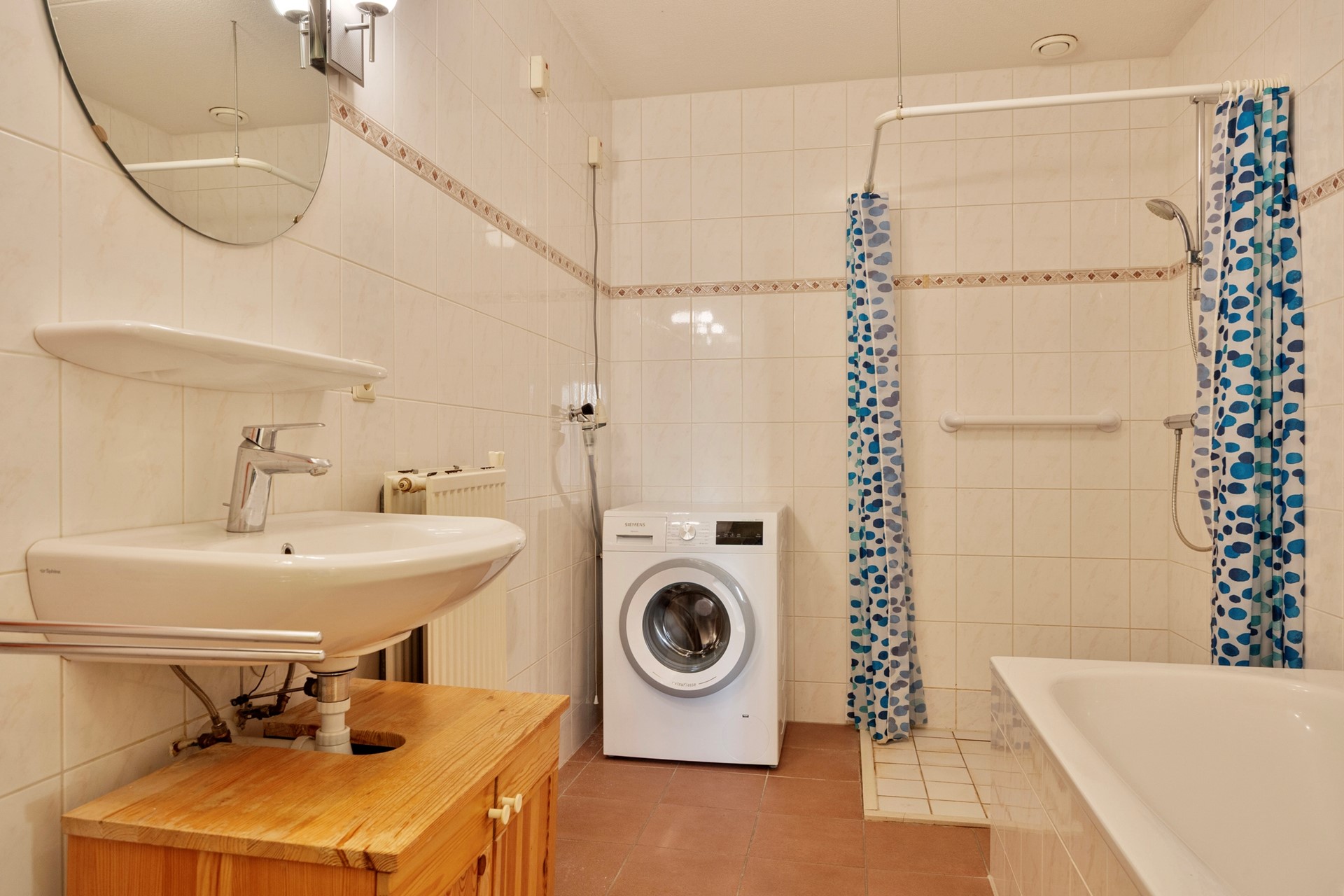 De badkamer is ruim en biedt plaats aan een ligbad, een open douchehoek en een wastafel. Teven zijn hier de opstelplaatsen voor de wasmachine en -droger gesitueerd.