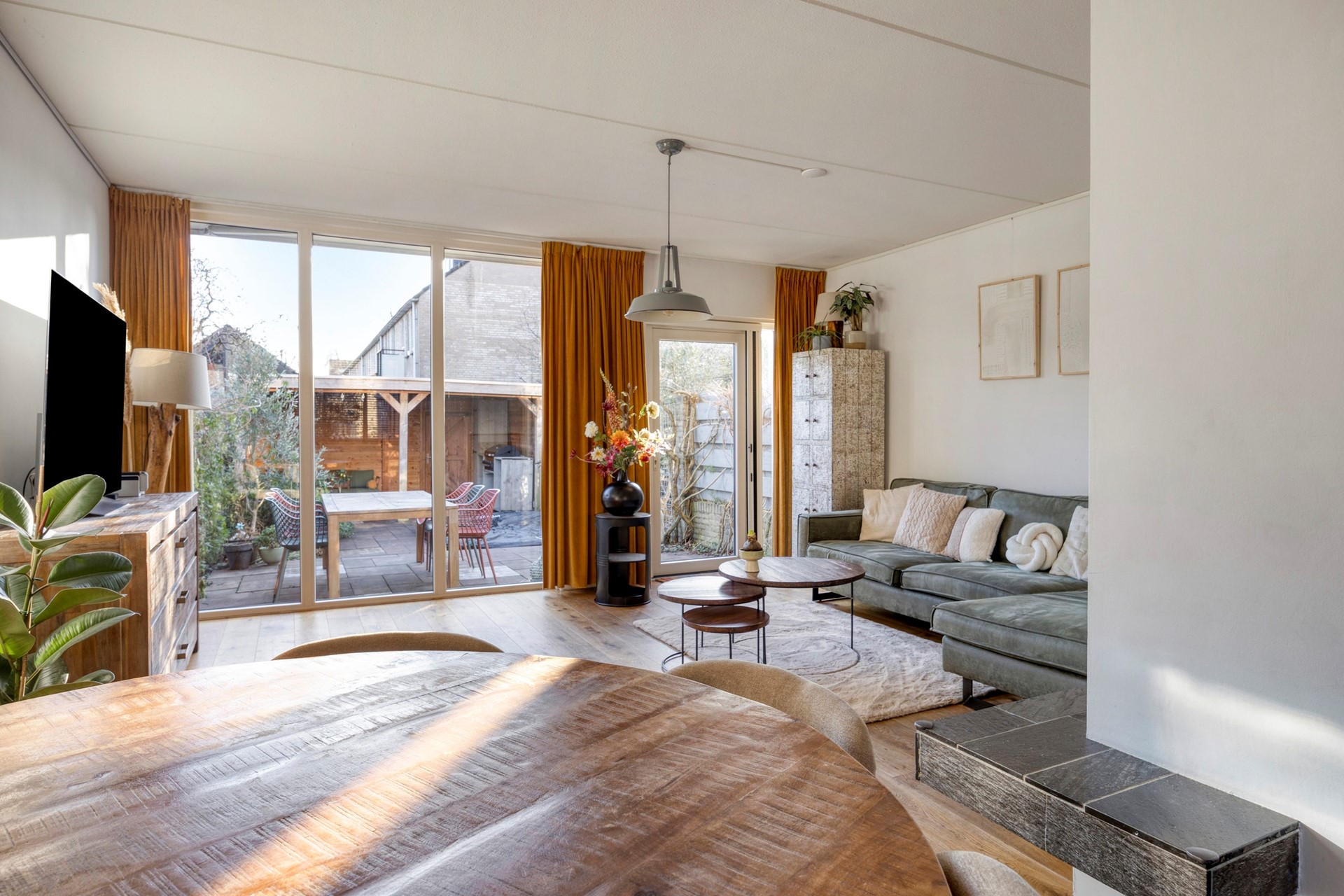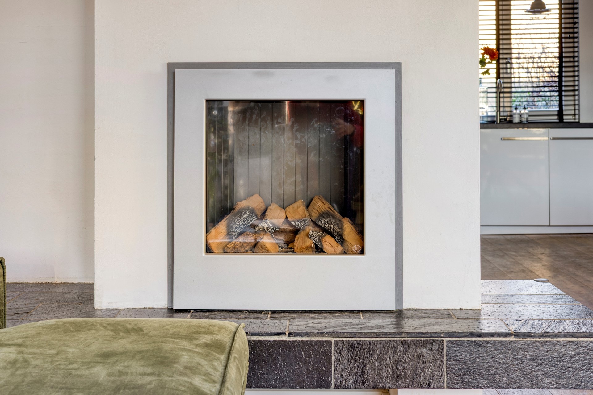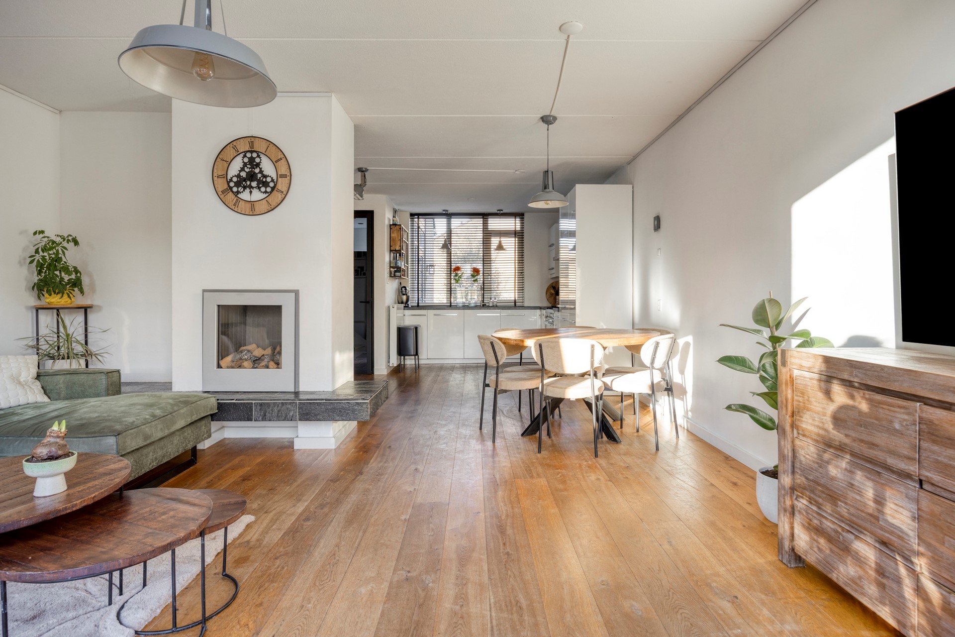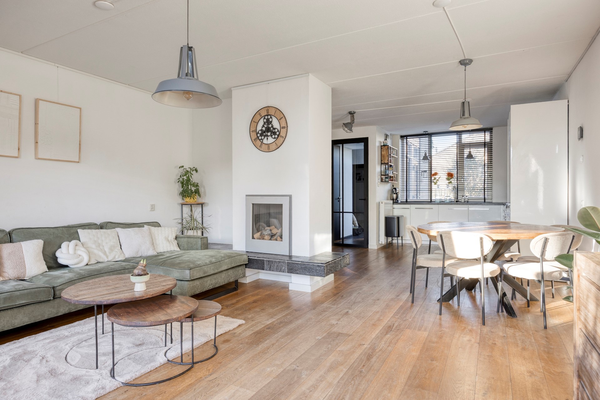 Ruime open woonkamer voorzien van een sfeervolle houten parketvloer en gashaard, welke door de plaatsing middenin de ruimte voor een speelse indeling zorgt. De woonkamer wordt van een behoorlijke dosis daglicht voorzien door de kamerhoge raampartij en via de achterdeur is er toegang tot de fraai aangelegde tuin.