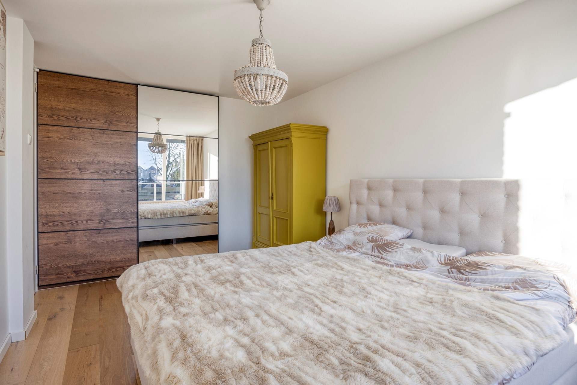 Ouderslaapkamer aan de achterzijde van de woning met toegang tot het balkon. Deze slaapkamer is voorzien van airconditioning.