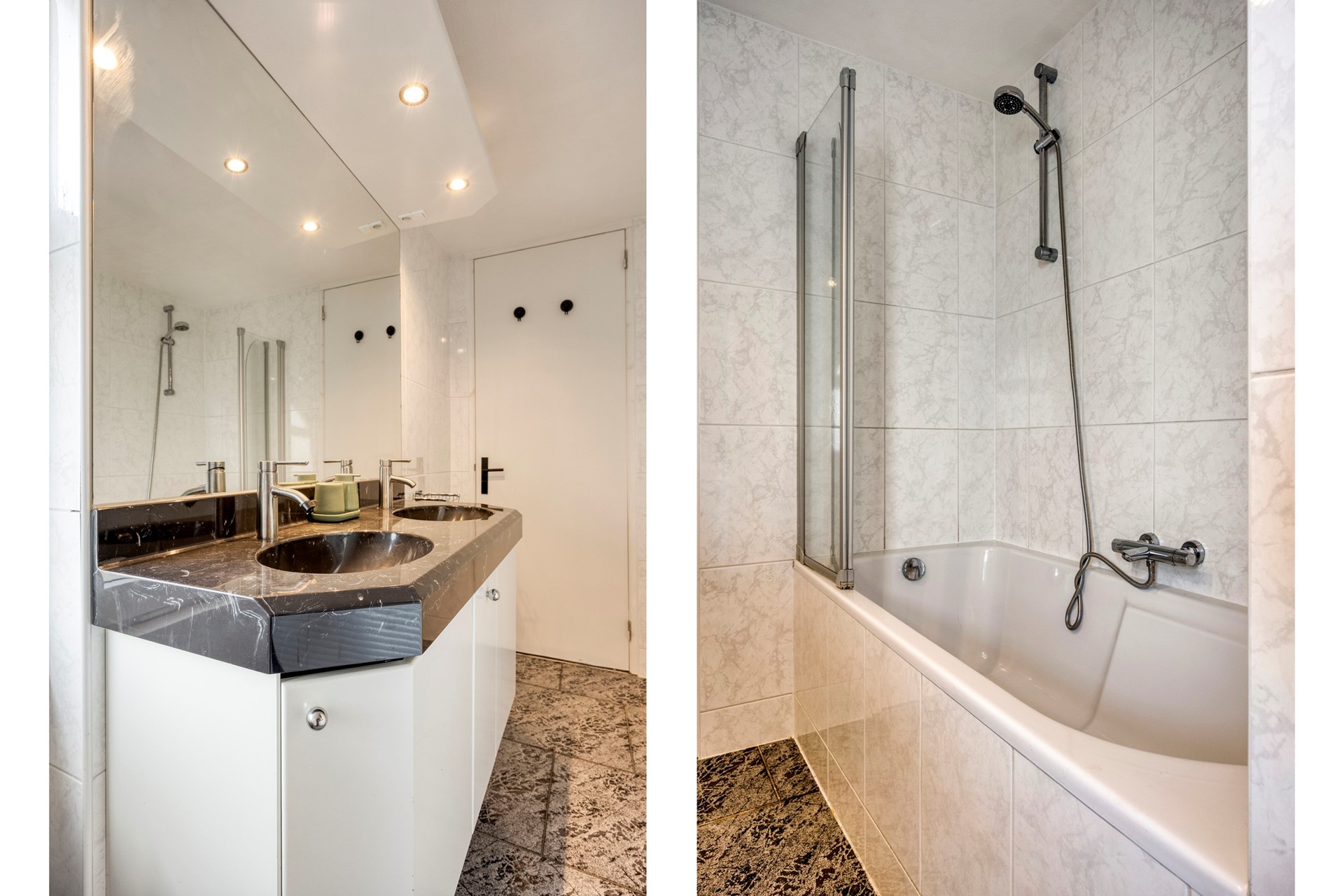 De badkamer is compleet en voorzien van een bad met douche, een wastafelmeubel met dubbele wastafel, een tweede toilet en de opstelplaatsen voor de wasmachine en droger.