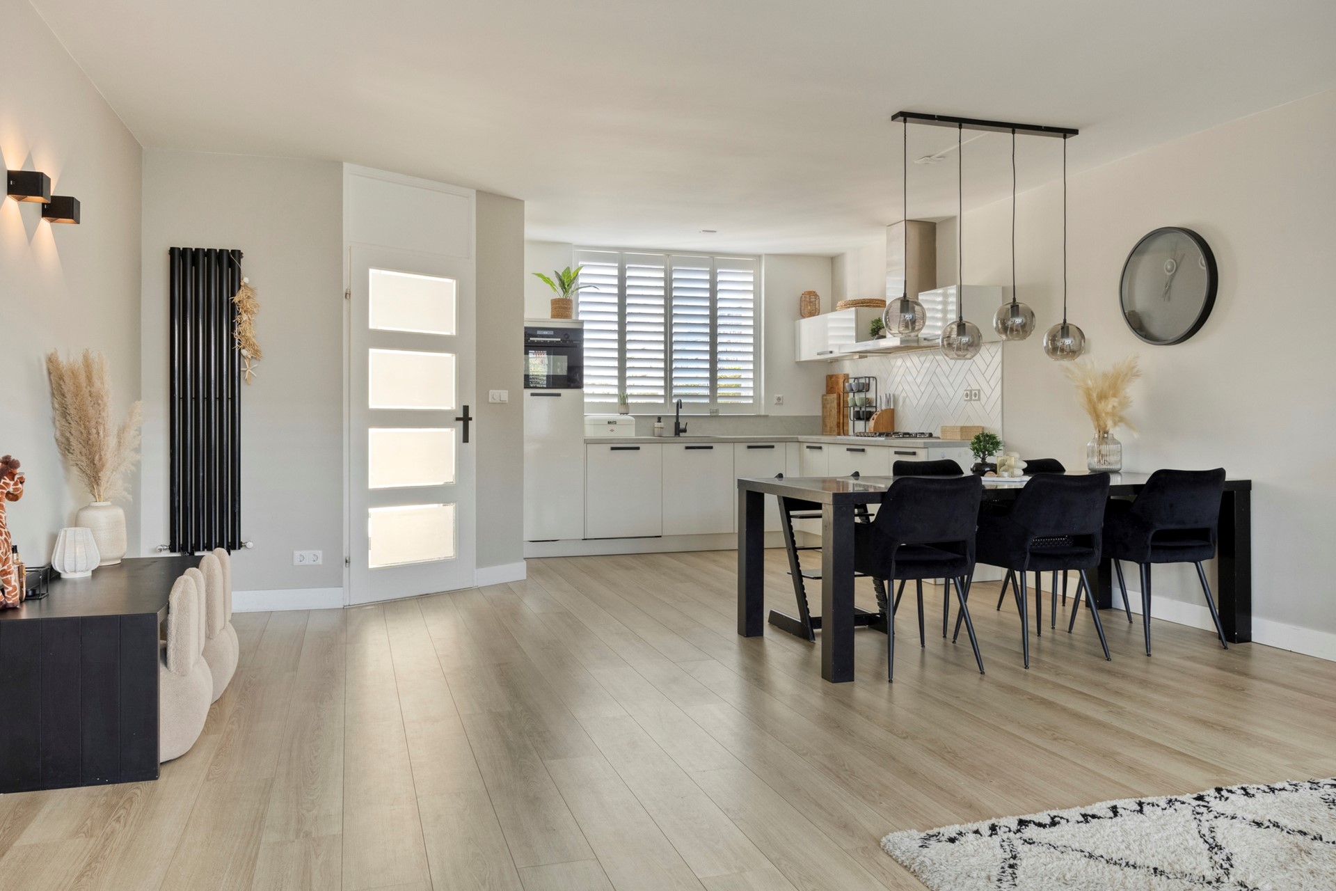 Moderne, ruime woonkamer met open keuken aan de voorzijde van de woning. Zonwering middels een sfeervolle markies en vanuit de woonkamer is er zicht op de fraai aangelegde achtertuin.