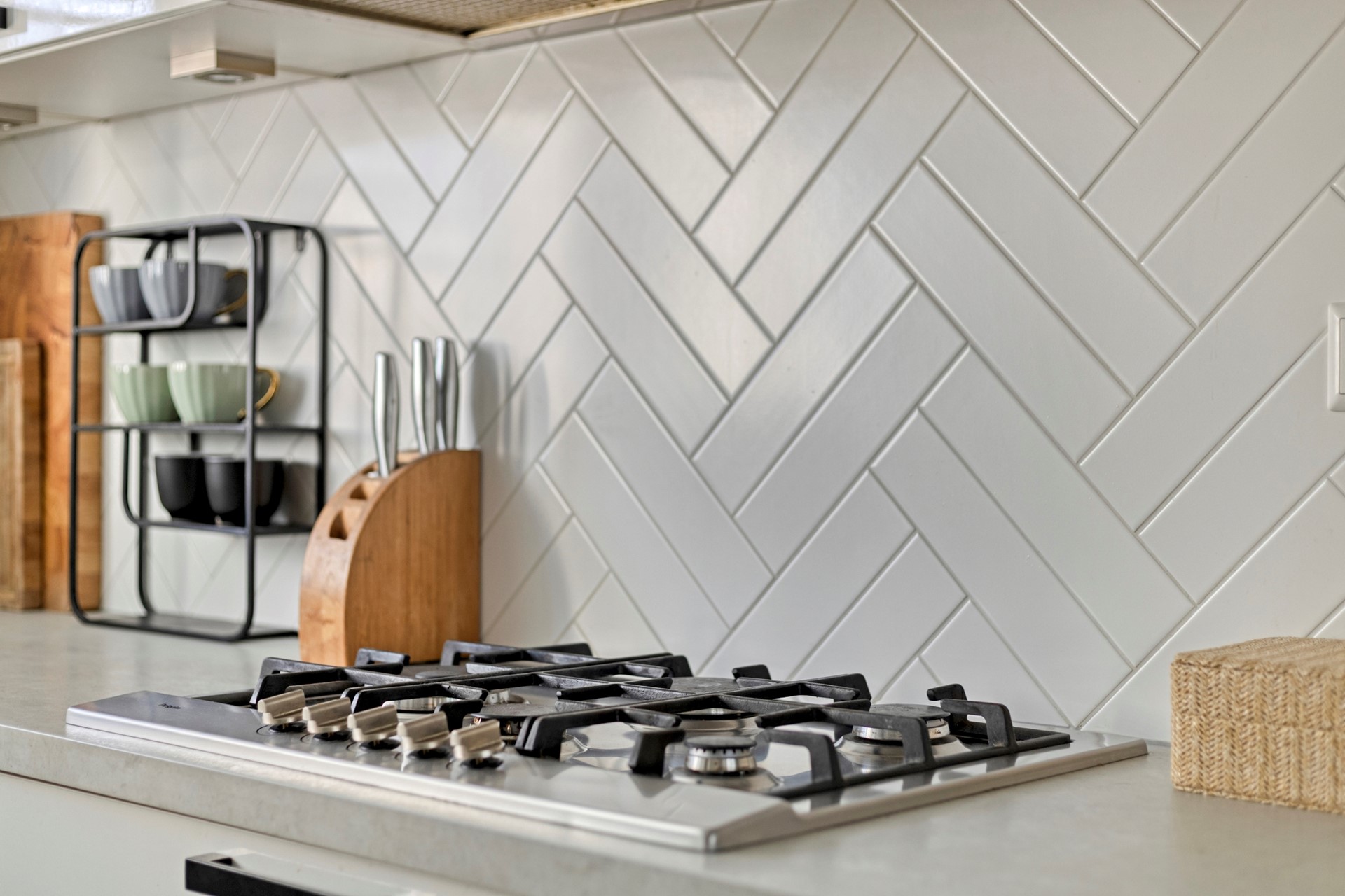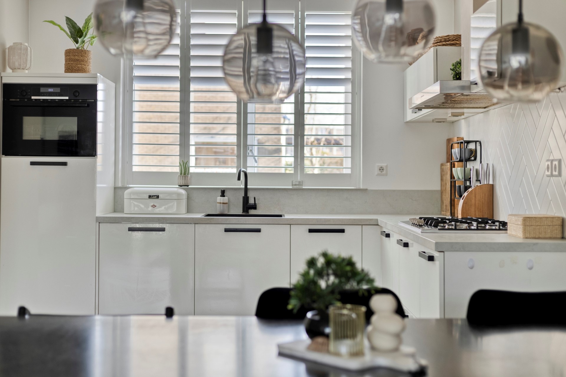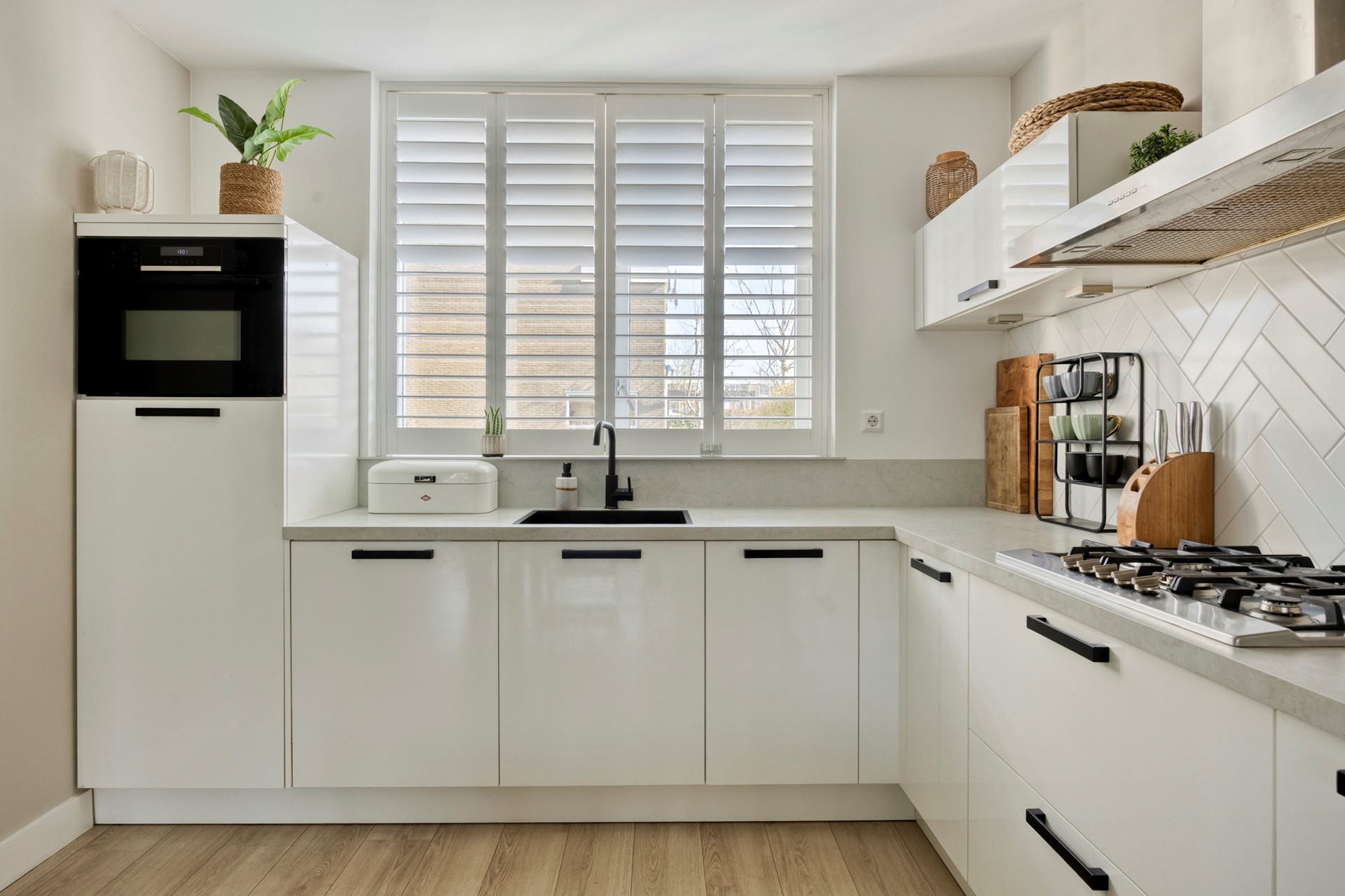 Lichte en moderne keuken in hoekopstelling aan de voorzijde van de woning. De keuken is voorzien van diverse inbouwapparatuur zoals een koelkast, een combimagnetron, een 5-pits gasfornuis, een vaatwasser, een warmwaterboiler en een afzuigkap.