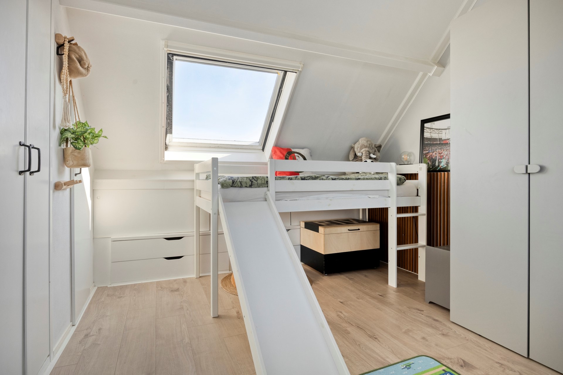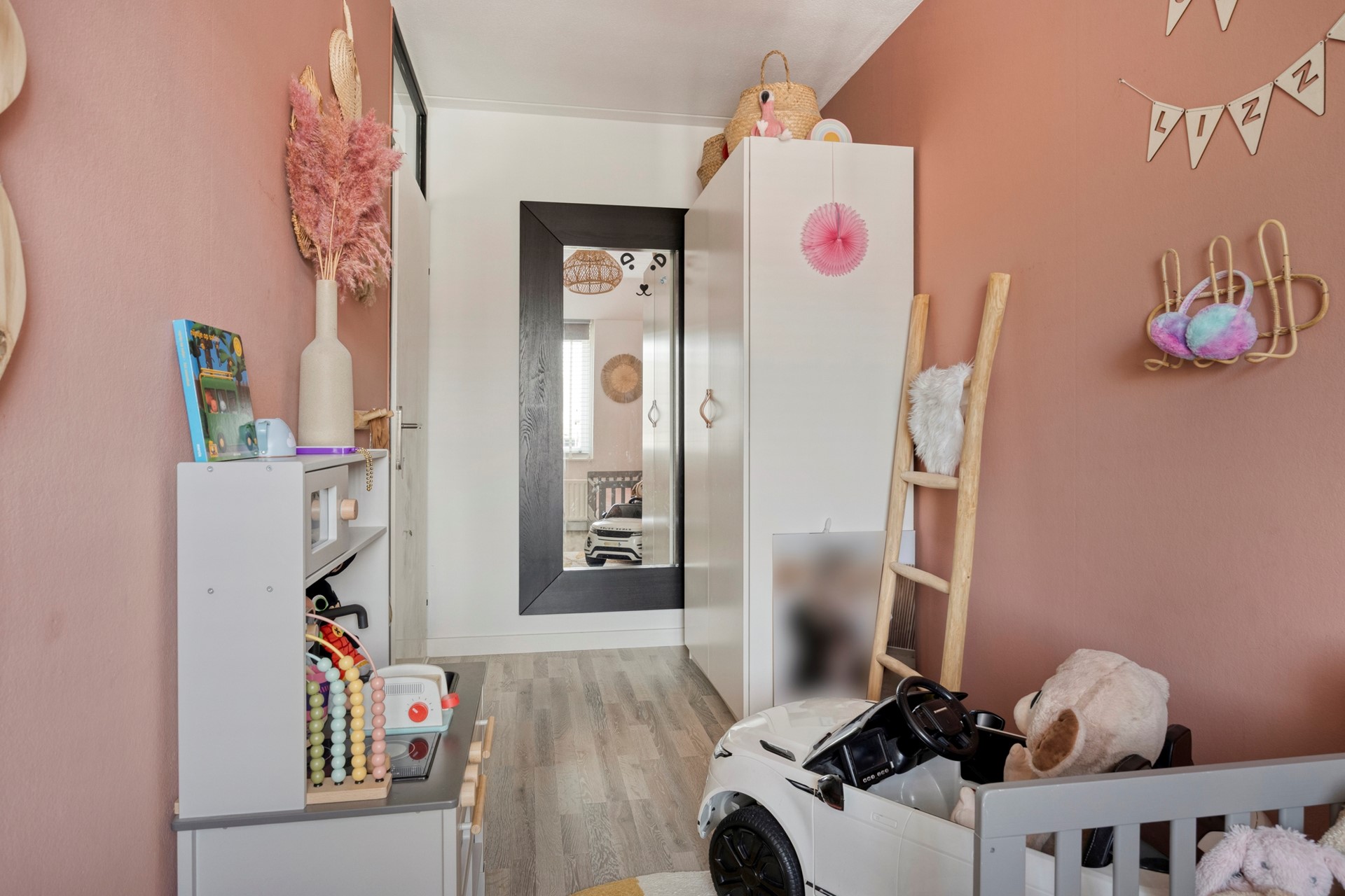 De tweede slaapkamer is momenteel in gebruik als sfeervolle kinderkamer en bevindt zich aan de net als de ouderslaapkamer aan de achterzijde van de woning.