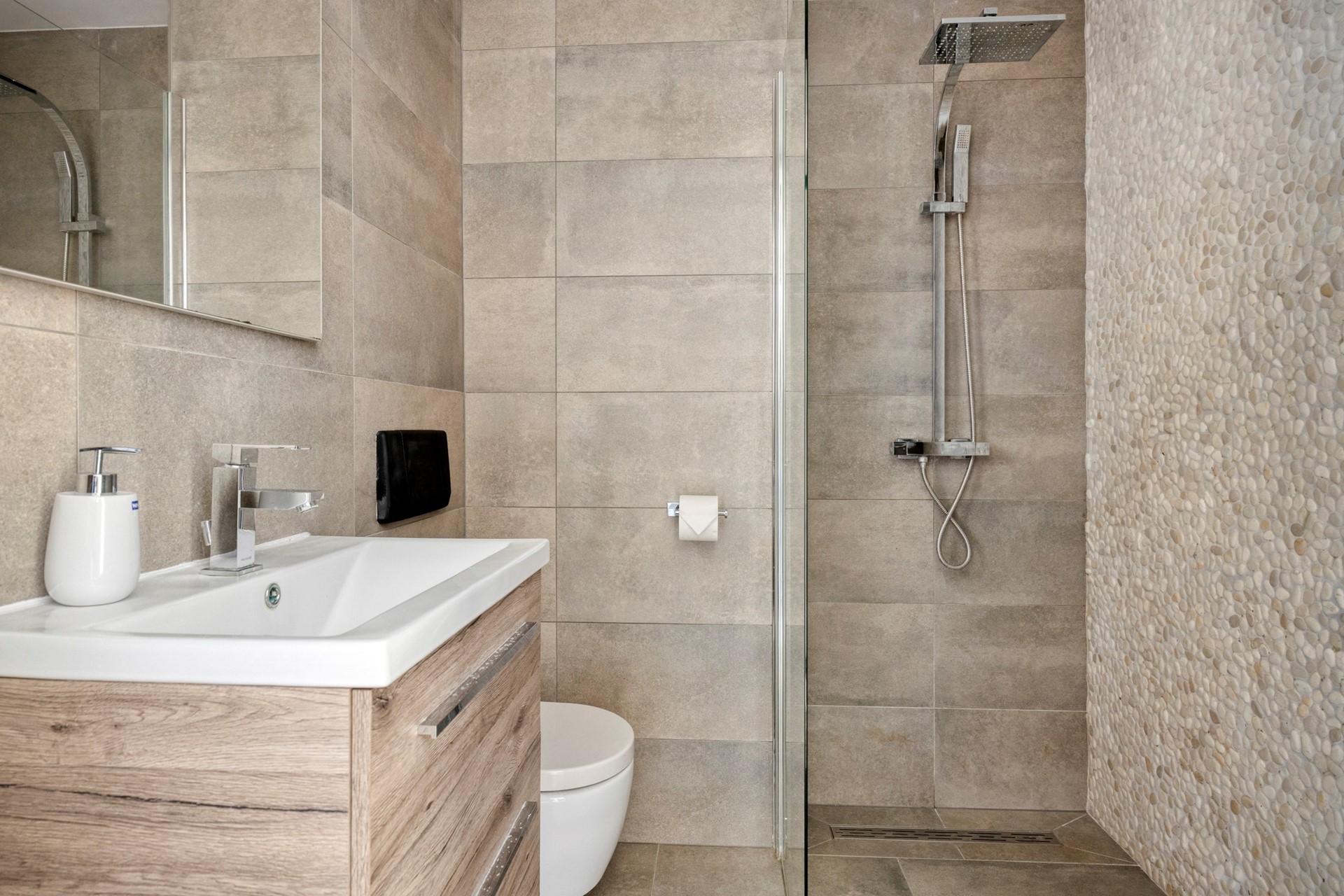 De in moderne kleurstelling opgetrokken badkamer is voorzien van een inloopdouche, een wastafelmeubel met spiegel en een tweede toilet.