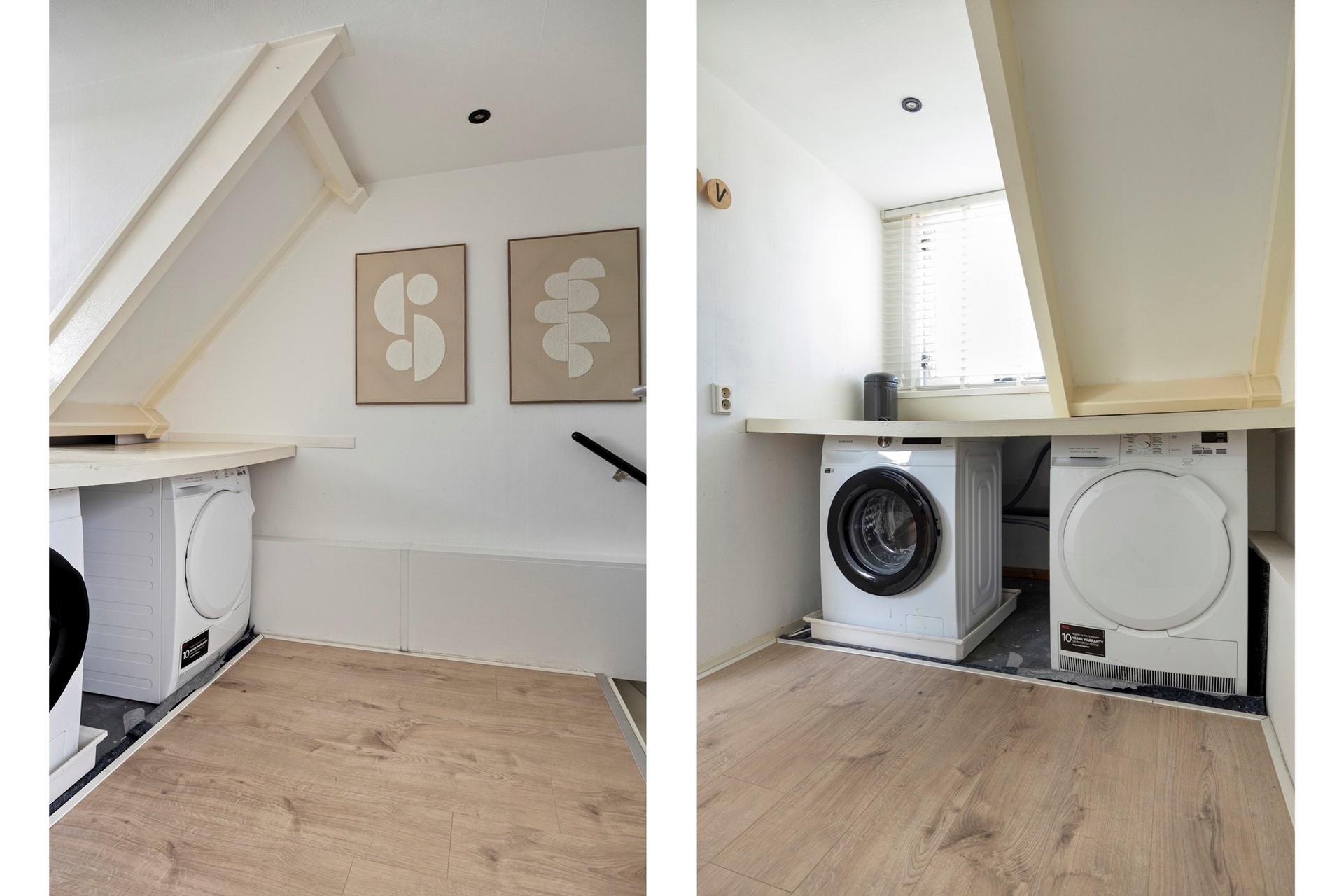 Voorzolder met opstelplaats voor wasmachine en -droger. Achter de betimmering boven de trap bevindt zich de cv-ketel. Vanuit de voorzolder is er toegang tot de zolderslaapkamer.