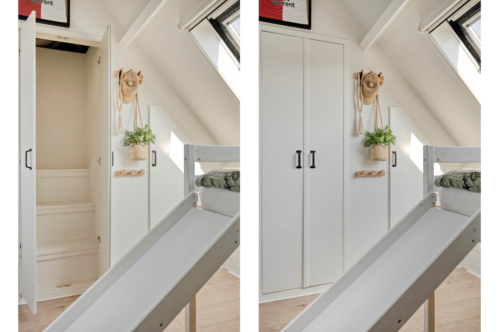 Ruime zolderslaapkamer met dakkapel aan de achterzijde en dakraam aan de voorzijde van de woning. Deze kamer zou een ideale tienerkamer kunnen zijn door de aanwezigheid van een eigen wastafel en een ‘geheime’ opgang tot de bergvliering!