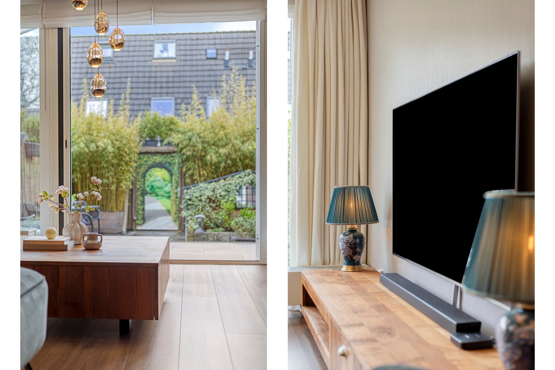 Zeer lichte en sfeervolle woonkamer met fraai uitzicht op de tuin. Het zitgedeelte bevindt zich in de uitbouw welke is voorzien van elektrische vloerverwarming en 2 elektrisch bedienbare dakvensters. De kamerbrede raampartij met openslaande deuren naar de tuin is voorzien van elektrische zonwering.