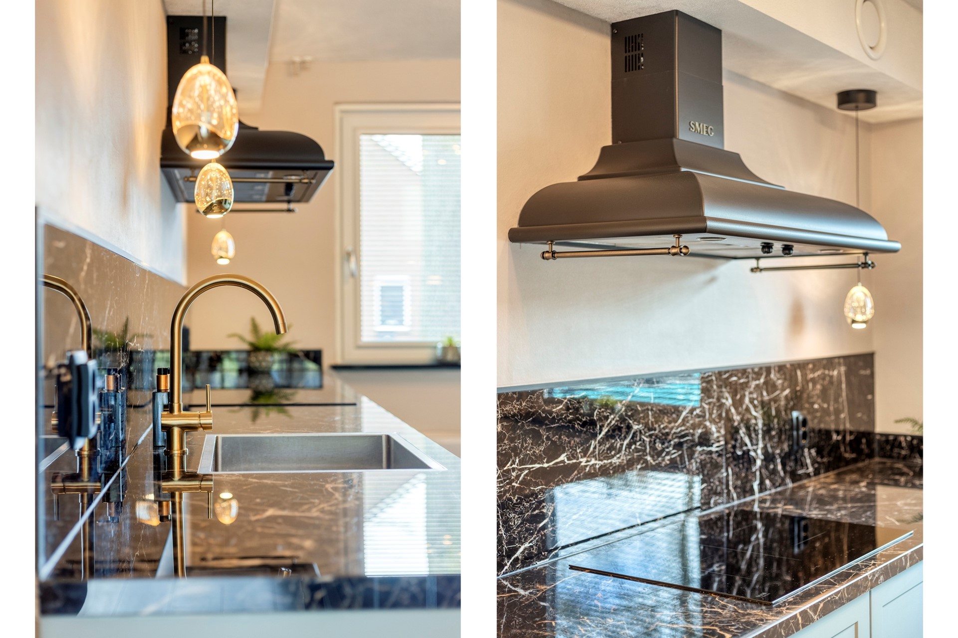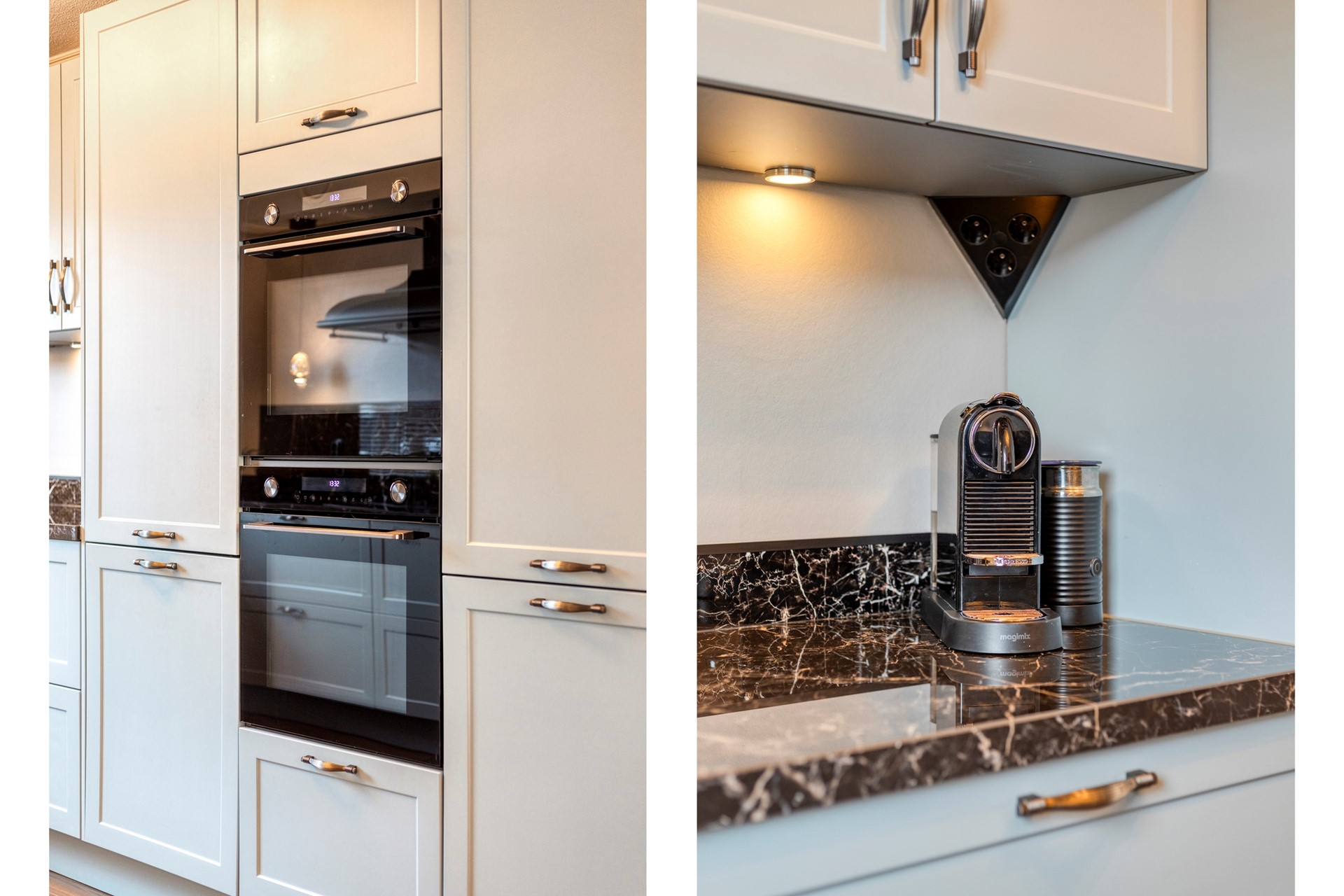 Ruime keuken aan de voorzijde van de woning. De jonge keuken (2022) voorzien van een fraai keramisch werkblad is werkelijk een plaatje en is ruim genoeg voor een groot gezin. Zo zijn er vele lades en kastjes aanwezig, is de keuken voorzien van een vaatwasser en een prachtige Smeg afzuigkap, een close-in-boiler (15l) en zijn er zowel twee combi-ovens als twee koel-vriescombinaties ingebouwd. Een Unico monoblock airco zorgt hier voor een fijne aanvoer van naar gewenst warme of koele lucht. Wát een luxe!