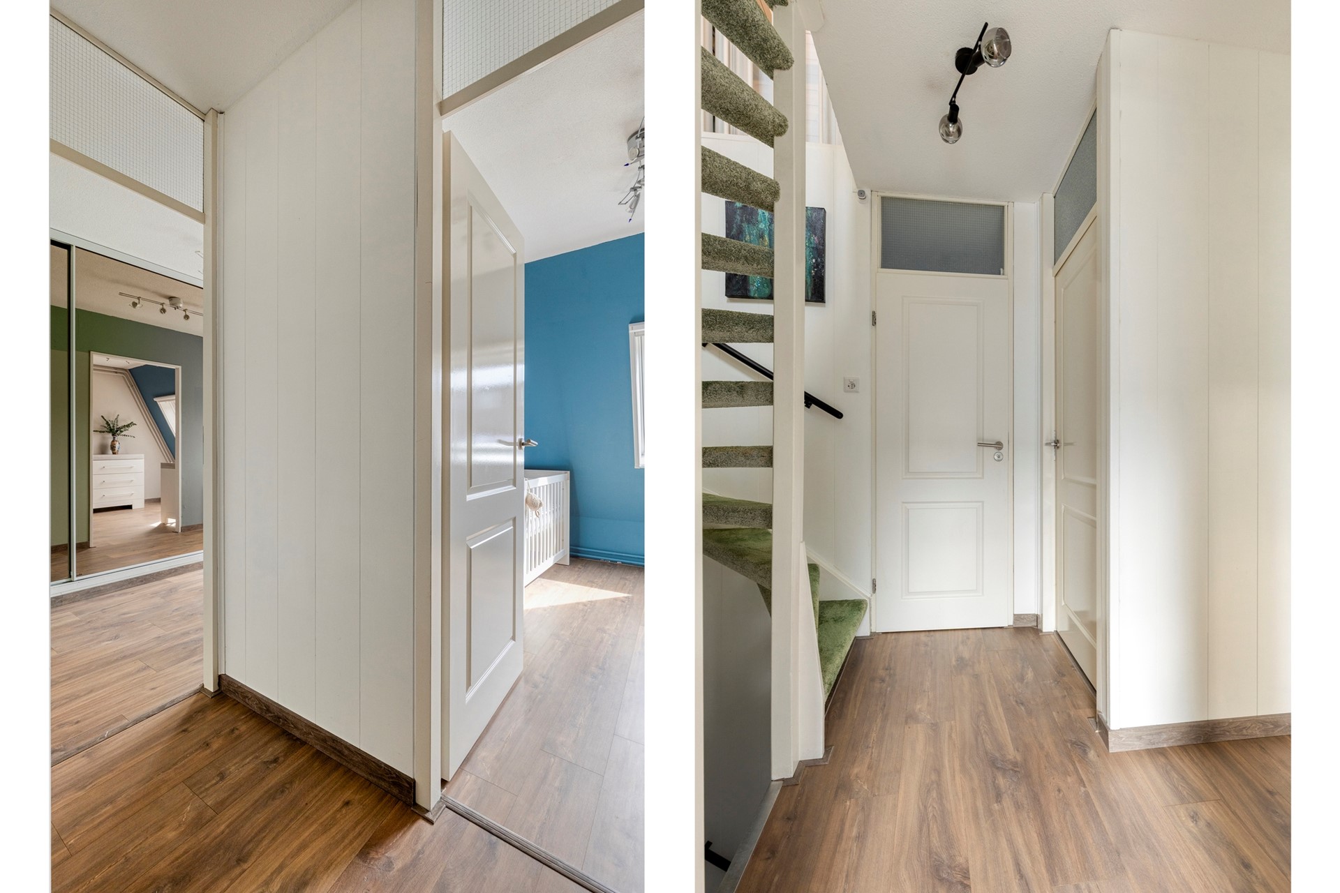 Overloop met toegang tot de slaapkamers, de badkamer en de trap naar de tweede verdieping.