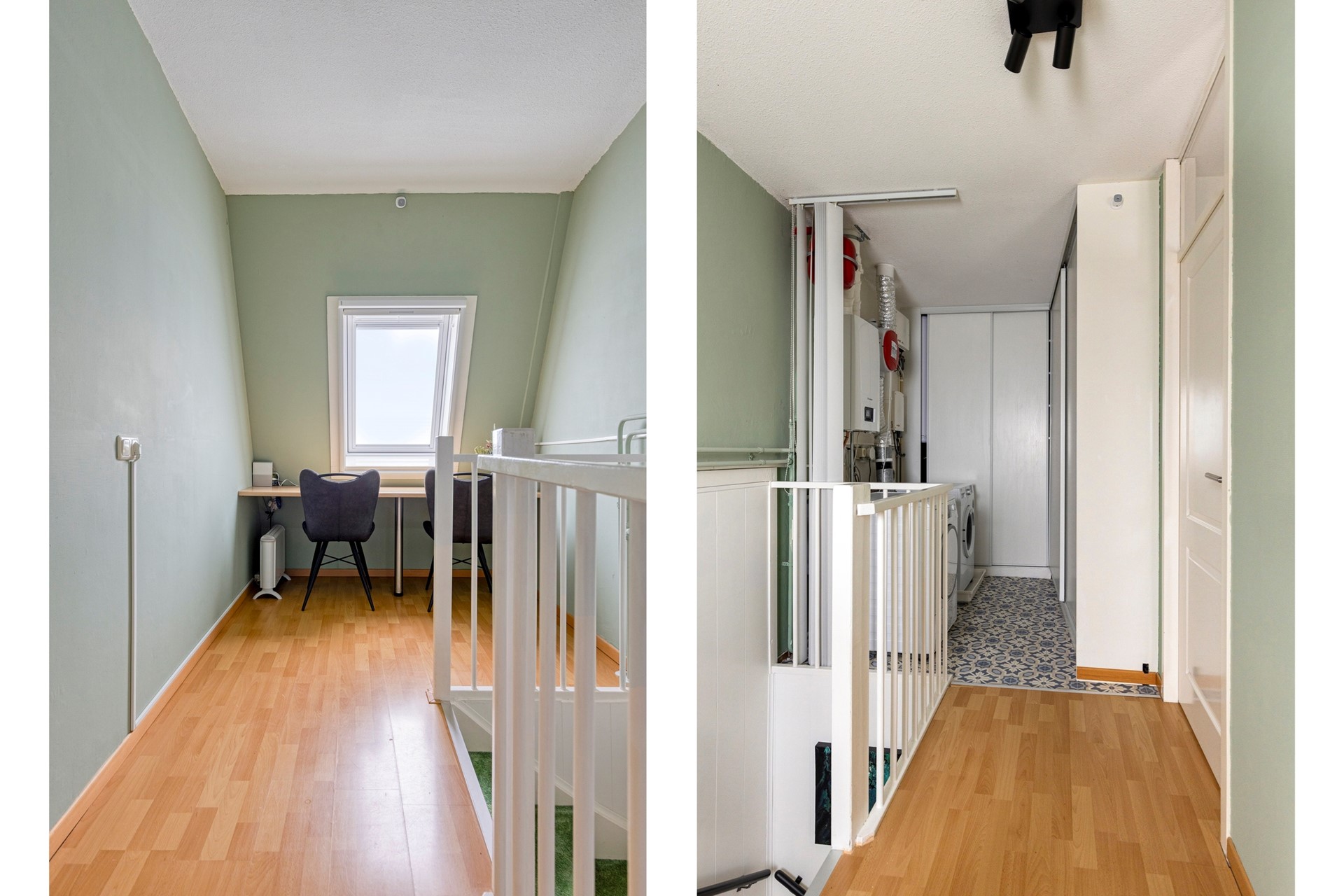 Voorzolder met opstelplaats van de wasmachine en -/droger en de technische installaties (cv-ketel, mechanische ventilatie unit en boiler) aan de voorzijde van de woning en een thuiswerkplek aan de achterzijde onder het Velux dakraam. Vanuit de voorzolder kan de vierde slaapkamer worden bereikt.